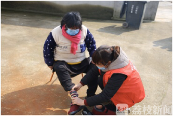 在逐户走访排查出住户唐某从安徽回来,她第一时间上报街道防指并落实“四包一”责任,每天跟着村医上门测量体温,耐心劝慰其做好防护,好好休息,最终帮助唐某一家顺利度过隔离期。五保户老人汪奶奶已经100岁高龄了,姚三美只要下村就一定会去老人家里,看看她有什么需要帮助的。老人家防护意识薄弱,她自掏腰包买来洗手液、口罩等物资,手把手教奶奶如何正确洗手、戴口罩。同样让她放心不下的还有精神残疾人士汪某,汪某早年丧偶,后与母亲一同居住,生活不能自理,不知冷热温寒。巡逻期间,姚三美见她穿着夏天的单鞋在路上瞎逛,心疼不已,利用中午休息的一点空档去新鞋、新袜。她为汪某换上厚实温暖的新鞋袜,像劝导孩子一样告诉汪某要听话,天冷了要加衣防止受凉感冒,疫情期间要戴好口罩,不要随意出门走动。
