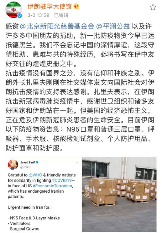 3日,伊朗驻华大使馆称,感谢@北京新阳光慈善基金会 @平澜公益 以及许许多多中国朋友的捐助,新一批防疫物资今早已运抵德黑兰,伊朗不会忘记中国的深情厚谊,这段守望相助、患难与共的特殊经历,必将书写在伊中友好交往的煌煌史册之中。