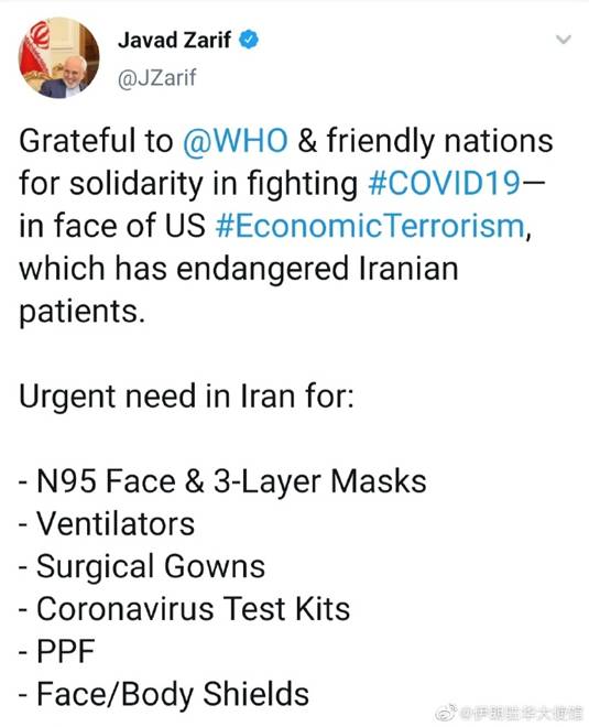 据伊朗驻华大使馆3日消息,伊朗外长扎里夫2日在社交媒体发文向国际社会对伊朗抗击疫情的支持表达感谢,他同时称,美国的经济恐怖主义正在危及伊朗新冠肺炎患者的生命安全,目前伊朗N95口罩和普通三层口罩、呼吸器、核酸检测试剂盒等防疫物资告急。