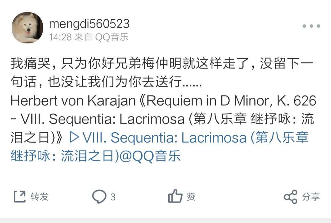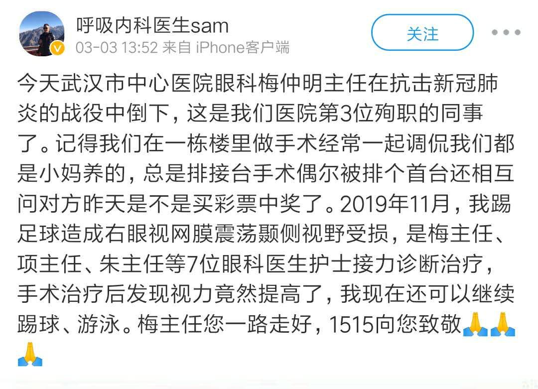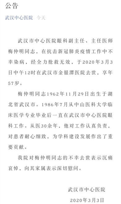 3月3日,武汉市中心医院发布公告称,该院眼科副主任梅仲明在抗击新冠肺炎疫情工作中不幸染病,经全力抢救无效,于2020年3月3日中午12时在武汉市金银潭医院去世,享年57岁。