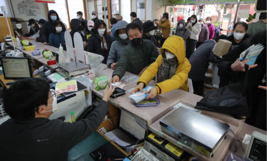 海外网3月3日电 为缓解口罩供应紧张难题,3月2日,韩国政府在邮局等官方定点销售处发售了588万个口罩。当天,韩国各地销售处都排起了长龙。韩国《中央日报》感慨,这人山人海的场面,堪比中秋节抢票。