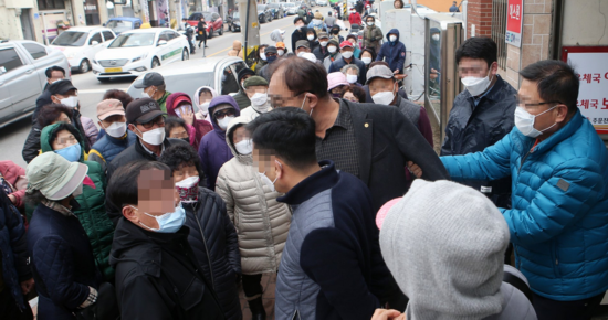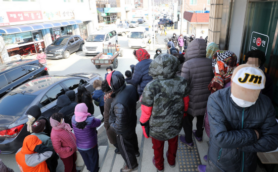 2日下午,韩国忠清北道清州市上党区龙岩洞,居民扎堆买口罩(《中央日报》)