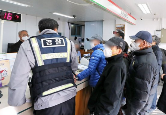 2日上午,京畿道南杨州市一家邮局里,没有拿到号码牌的市民不断抗议,引来警察维持秩序。