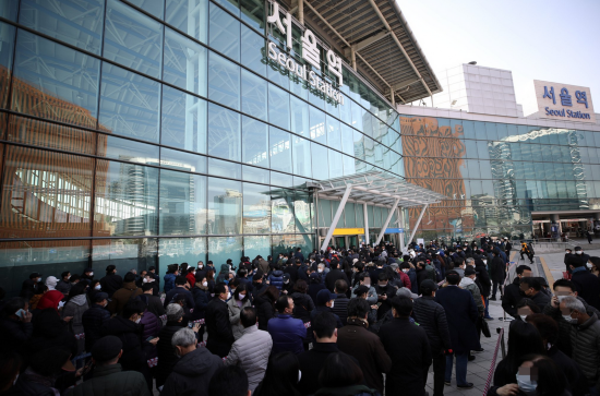 2日下午,首尔站一处口罩销售点附近,市民排起长队。