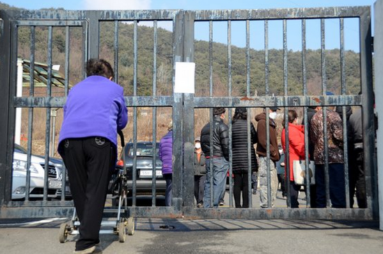 2日上午,韩国江原道春川市一家邮局前,一位迟到的老奶奶没排上号,只能在关闭的铁门外张望。