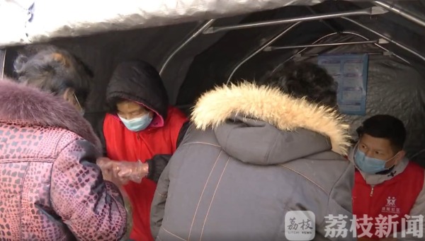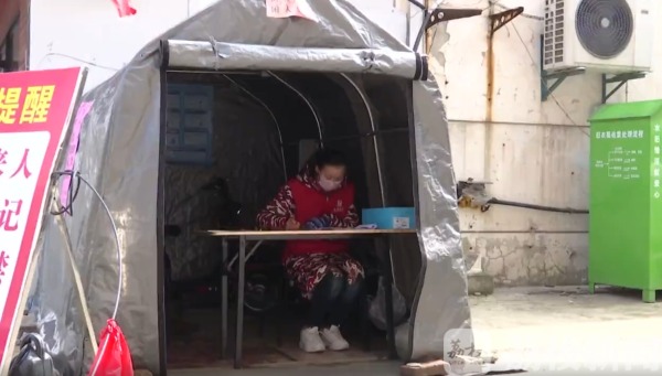 一开始,卡口只有一张桌子和一张椅子,下雪降温的那几天,特别难熬。社区看到后给他们配备了帐篷,街坊邻居也常来嘘寒问暖送吃的,小悦特别感动:“好多爷爷奶奶过来问我,你冷不冷啊?我就感觉这一切更加值得了。因为我看到了很多温暖和善意,我一定把这件事做好,把这个小区的大门守好。”