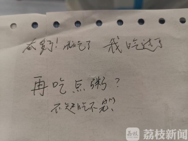 11床的爷爷以前中风过,口齿不清有沟通障碍,吞咽功能也稍有欠缺,我们就在他床边放了纸和笔方便交流。早上7:00,我统计他24小时尿量,发现只有600ml,偏少。忙完书写记录,7:30我去看他,发现地上有些尿渍,估计是夜里在床边解小便,不小心弄到地上,初步判断尿量统计有偏差。看看床头柜上的早饭只有一小碗白粥吃完了,鸡蛋和包子还在,我问他:“爷爷你怎么不吃了?”他拿起笔颤颤巍巍地写下一行字“太多了,我吃了,我吃过了。”