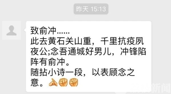 近日,正在湖北黄石大冶人民医院驰援的医生俞冲,收到了来自家乡南通的特别问候。这是南通市第三人民医院院长蔡卫华专门为他所作的一首诗。