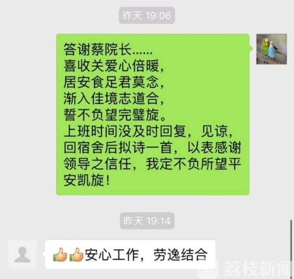 远在大冶人民医院三病区支援的俞冲,直呼“暖到了”。而被同事们誉为集胆略与才情于一身的俞冲,也用小诗回应了院长的关爱。
