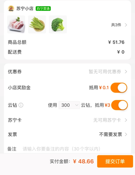 于其他网购平台,苏宁菜场的菜品价格基本与市场持平,400g西红柿5.78元,550g小青菜1.98元,450g带皮五花肉也比超市中的价格略低,仅需32.5元。此外,每天还有2元和5元的支付券可抢,苏宁云钻也能够相应抵扣一定金额。