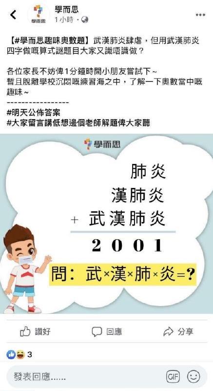 “肺炎+汉肺炎+武汉肺炎=2001,问:武x汉x肺x炎=?”有网友反映,香港学而思近日在社交平台发布了这样一道题目。随后,香港学而思回应称,题目来自网络,未经学而思老师审核,已第一时间下架相关内容。