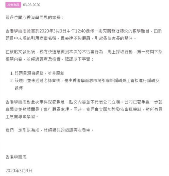 第一则公告为《致歉信》,香港学而思称其发布的有关新冠肺炎的数学题目“未规范引用病毒名称,且表达不够严肃”。题目发出后,校方意识到本次不恰当的行为,并第一时间下架了相关内容。