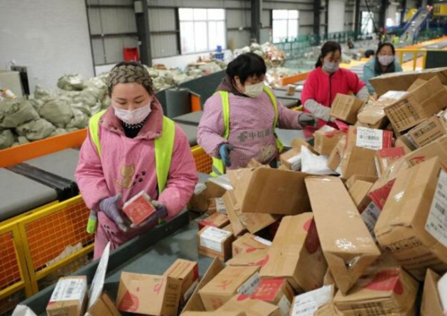 戴着口罩的工人将快递包裹送上自动分拣设备