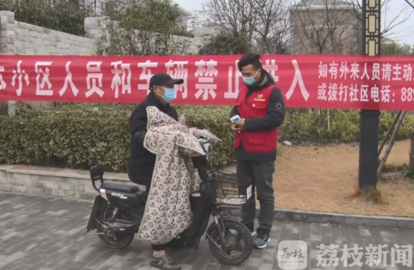 上午九点,宿迁市宿豫区豫东新城小区卡口,身穿红马甲的汪刚正在对进出小区的人员进行信息登记、测量体温。他和爱人迟亭都是80后,从2月6号开始,这一对“夫妻档”就主动报名,在社区参与疫情防控工作。他俩采取的是“白加黑”轮班模式。党员志愿者汪刚说:“因为我女儿比较小,每当我晚上出来执勤的时候,我女儿都说爸爸你晚上在家陪我一会儿吧,但我执勤是为了社区人员安全,所以说我还得狠下心来去执勤。”