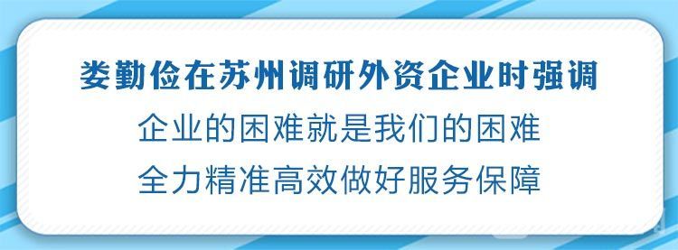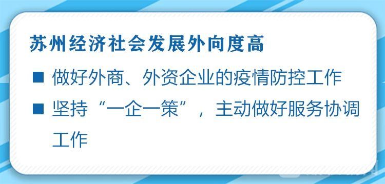 调研中,娄勤俭强调,苏州经济社会发展外向度高,一定要做好外商、外资企业的疫情防控工作,针对国外疫情变化,在坚持国民待遇、热情服务的同时,做好精准防控。要针对复工复产中出现的各种问题特别是供应链方面的困难,坚持“一企一策”,主动做好服务协调工作。