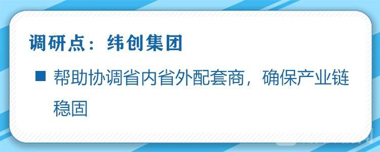 纬创集团专注于开发制造信息与通讯产品,目前企业到岗员工超过2.3万人。当地政府帮助企业梳理产业链“树状图”,精准高效服务复工,以龙头企业的稳定带动全产业链的稳定。娄勤俭说,信息制造业产业链长、上下游关联企业多,要发挥我省产业体系完善的优势,根据企业所需,帮助协调省内省外配套商,确保产业链稳固。