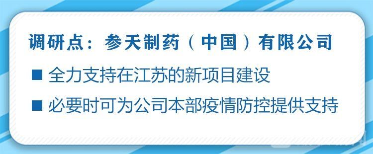 参天制药(中国)有限公司专注于眼科医药制造,计划在苏州工业园区新建研发生产基地。娄勤俭考察企业生产情况后,与总经理山田贵之视频连线。娄勤俭说,江苏始终把外资企业当作自己的企业,把你们的员工当作本地员工提供保障,全力支持贵公司在江苏的新项目建设,同时也非常愿意分享我们防控疫情的经验,必要时可为你们公司本部疫情防控提供支持。