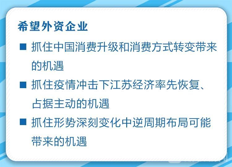 娄勤俭强调,这次疫情对当前经济发展的影响,不会改变我们经济长期向好的趋势。希望外资企业坚持用系统性思维看待前进中的困难和问题,抓住中国消费升级和消费方式转变带来的机遇,抓住疫情冲击下江苏经济率先恢复、占据主动的机遇,抓住形势深刻变化中逆周期布局可能带来的机遇,积极主动作为,在应对困难挑战中实现更大发展。