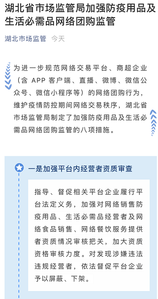 荔枝新闻讯 据“湖北省市场监督管理局”微信公众号消息,为进一步规范网络交易平台、商超企业(含APP客户端、直播、微博、微信公众号、微信小程序等)的网络团购行为,维护疫情防控期间网络交易秩序,湖北省市场监管局制定了加强防疫用品及生活必需品网络团购监管的八项措施。