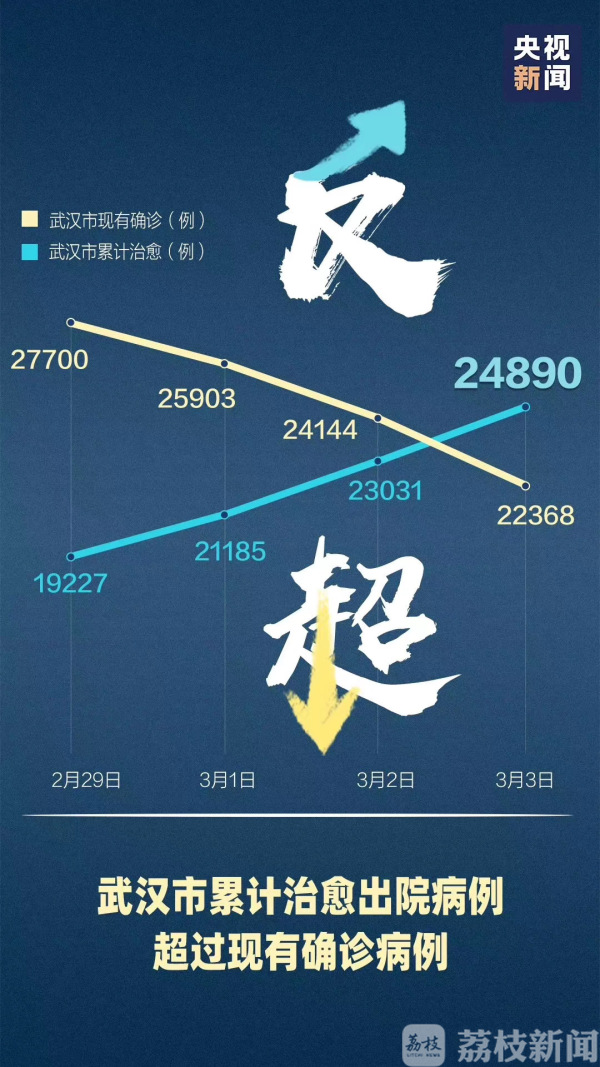 3月3日,还有一个好消息,武汉市累计治愈出院的病例首次超过现有确诊病例,这是历史性的一刻,每一例出院数字代表一个家庭,预示着一份即将到来的团聚,我们也要更加努力,为了成就更多的团圆。