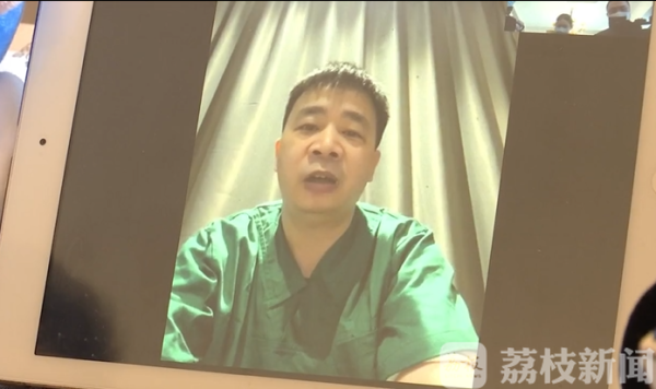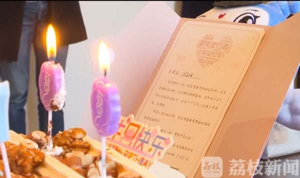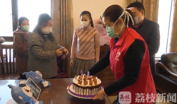 无锡二院志愿者赵弘卿给徐益明带来了科室同事的祝福视频, 同事们说:“我们热切地期盼你早日平安归来,徐益明加油, 武汉加油! 生日快乐。”