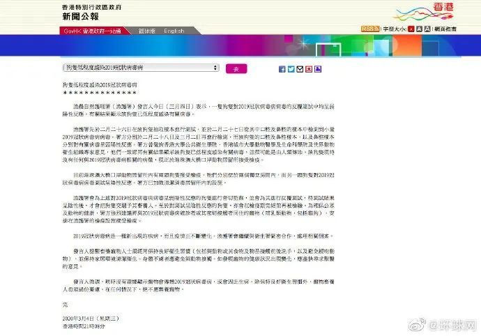 3月4日,香港渔农自然护理署(以下简称“渔护署”)发布公告称,该犬确诊“低程度感染新冠病毒”。据媒体报道,这系世界首例。