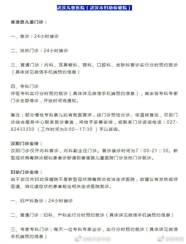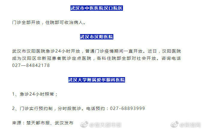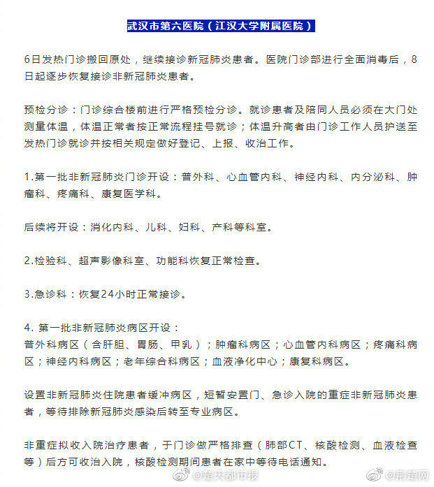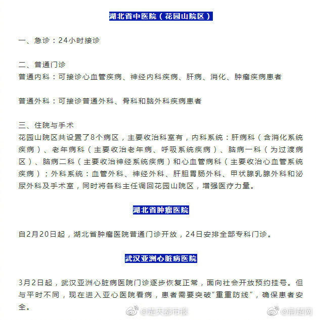 随着抗疫的进行,武汉部分医院已恢复恢复正常门诊,详情请戳图↓↓↓