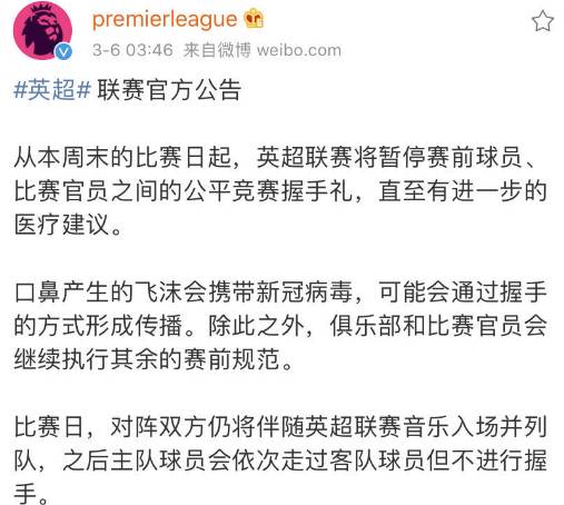 北京时间6日凌晨3时许,英超在官方微博@premierleague发布了上述消息。英超称,口鼻产生的飞沫会携带新冠病毒,可能会通过握手的方式形成传播。除此之外,俱乐部和比赛官员会继续执行其余的赛前规范。