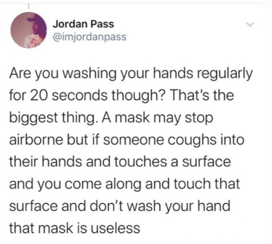 你能保证每次洗20秒钟的手吗?那才是头等大事。口罩可能会阻止空气传播,但是如果一些人将病毒咳在了他们的手上,又去摸别的地方,结果你无意间摸了这些地方但却没有洗手,口罩也保护不了你。