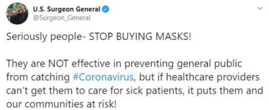 美国卫生总署负责人Jerome Adams也发布推特,呼吁民众停止购买口罩:真的大家——别买口罩了!它们对防止病毒传播并没有作用,但是如果医护人员没有口罩来照顾病人,那我们的社区都会很危险!