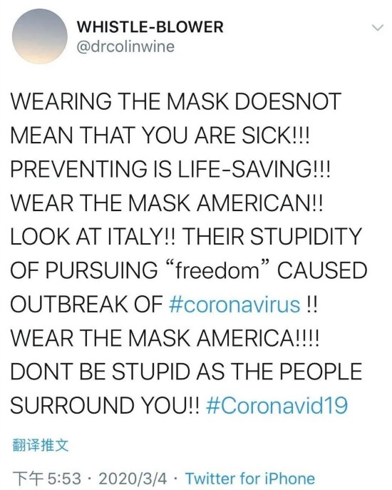 戴上口罩并不代表你有病!!预防就是救命!!!!戴上口罩吧美国人!!看看意大利!!他们对“自由”的愚蠢追求导致了冠状病毒的爆发!!戴上口罩吧,美国人!!别像你周围的人那么傻!!