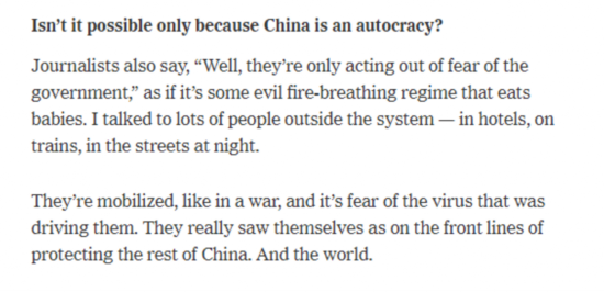 对这类说法,艾尔沃德做出了回应:“(某些西方)记者们会说,人民是出于对政府的恐惧才配合防控措施的,中国政府就好像是个会喷火、吞食婴儿似的恶魔。”但我也和许多体制外的人交流过——在旅馆里、火车上、街头。