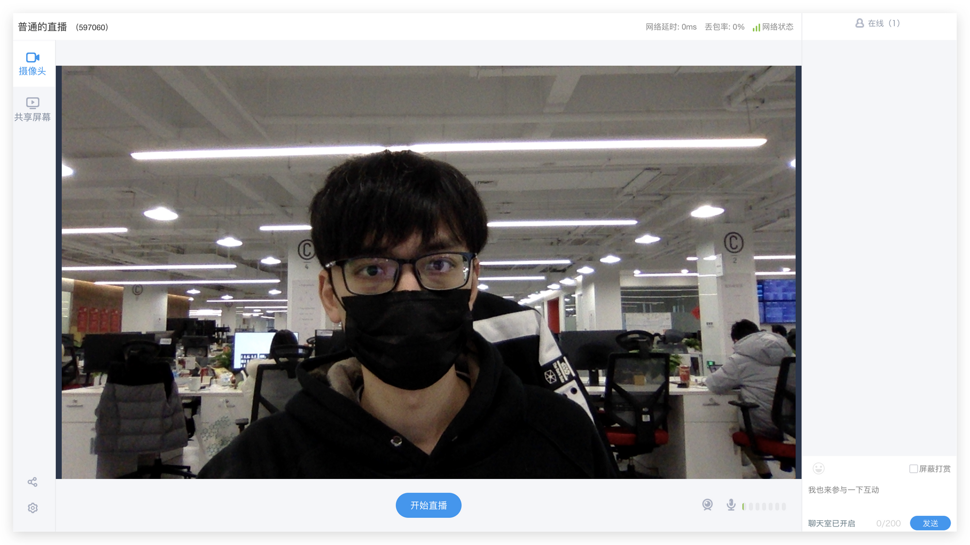 普通直播模式,支持选择摄像头直播或投屏直播,且支持在聊天区和学员进行互动。