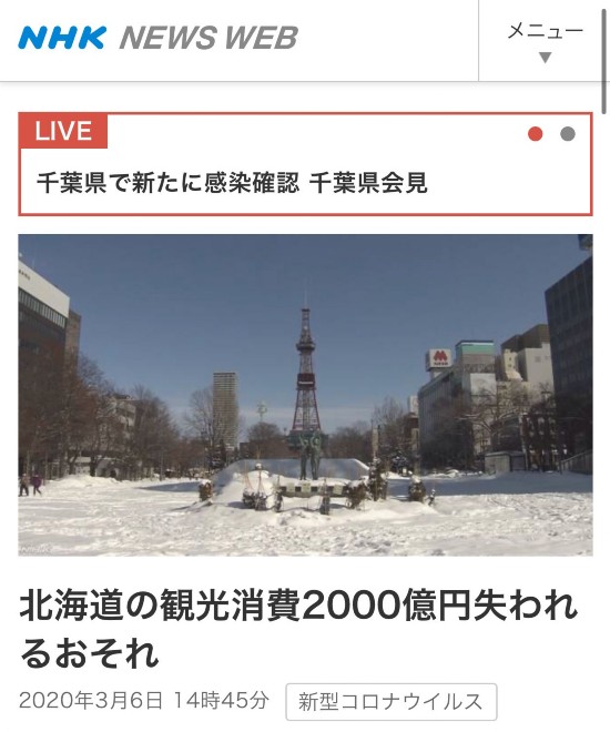 据此前NHK报道,因为新冠肺炎疫情持续扩大,北海道知事铃木直道已于上个月28日发表“紧急状态宣言”。截至当地时间3月6日16时,北海道新增7例确诊病例,累计确诊患者已达90人。