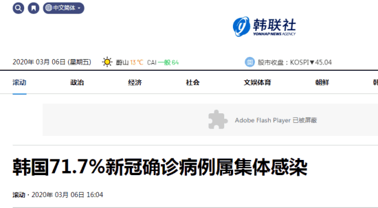韩国中央防疫对策本部本部长郑银敬6日在记者会上表示,境内感染新型冠状病毒(COVID-19)确诊病例中71.7%与集体感染有关,较前一天增加2.3个百分点。