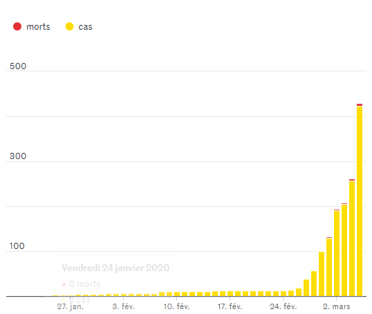据法国《世界报》5日报道,当天晚上,法国卫生部长表示,在过去24小时内法国新增新冠肺炎确诊病例138例,累计确诊423例,其中23例为重症患者。此外,新增3例死亡病例,累计死亡7例。