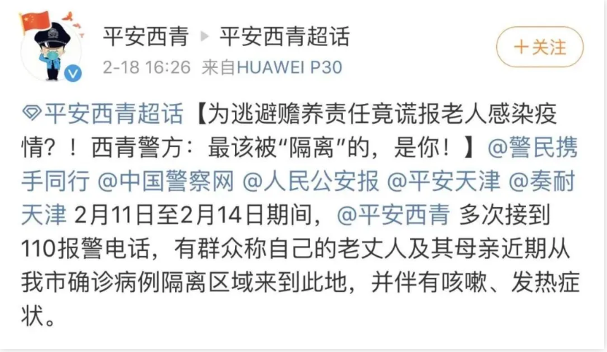 朱某(天津市西青区人)为了不想再承担对岳父及其母亲的赡养义务,使二人尽快离开自己家,2月11日-2月14日期间,他多次报警称,两位老人近期从天津市确诊病例隔离区域来到此地,并伴有咳嗽、发热症状。