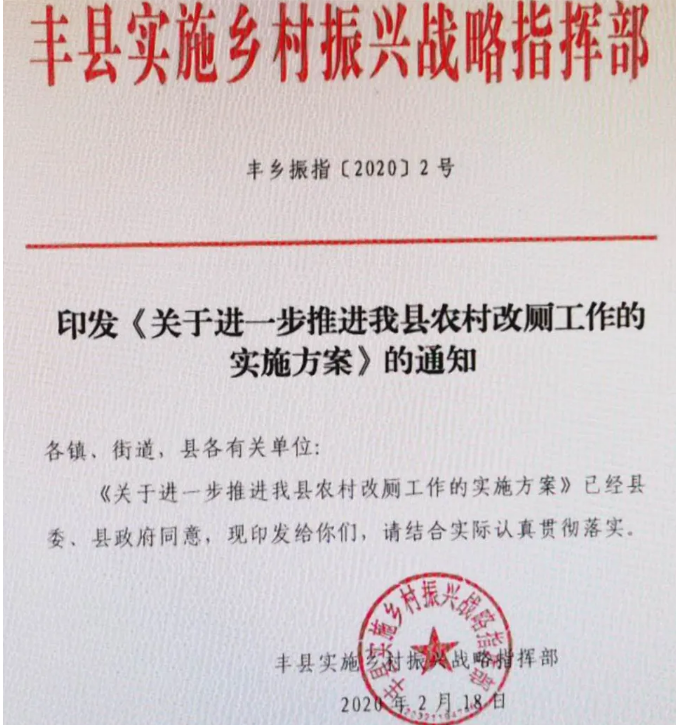 “小康不小康,厕所算一桩”,厕所环境的好坏,直接关系到人们的生活质量和身体健康,为进一步加快农村改厕步伐,改善农村人居环境,建设美丽宜居乡村。江苏省徐州市丰县县委、县政府决定全面推进农村改厕工作,提升广大农民群众幸福感和获得感。