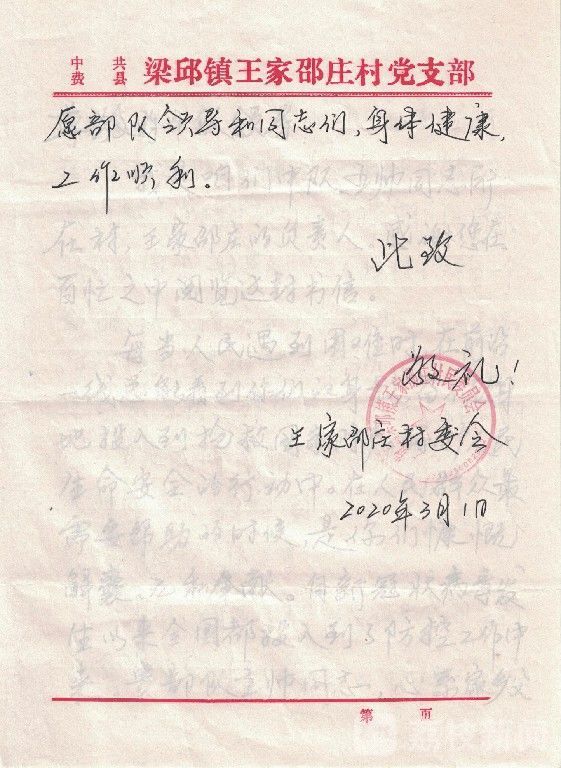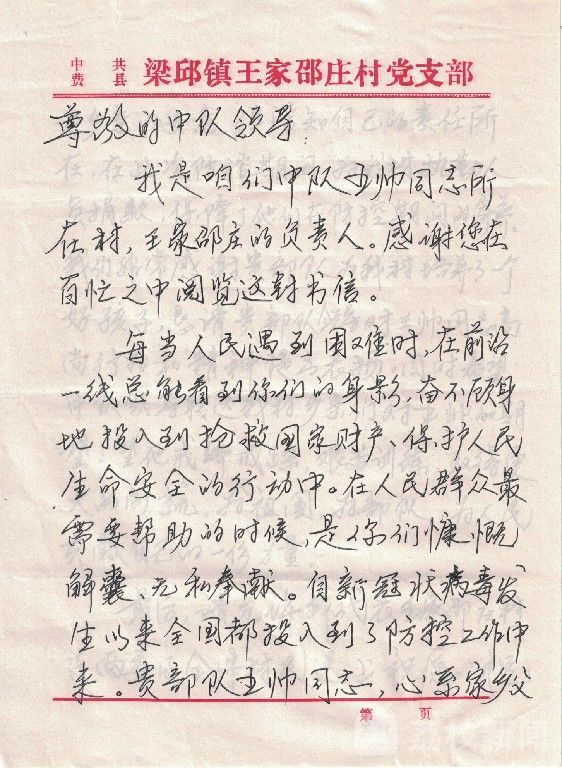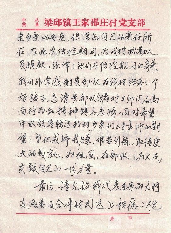 这是一封从山东省临沂市费县梁邱镇王家邵庄村党支部寄来的书信,信中写到中队下士王帅,心系疫情期间家乡父老乡亲安危,主动为村里执勤人员捐款的事情。信中表达了村党支部对中队培养出懂事好孩子的感谢,以及对中队建设发展的美好祝愿。