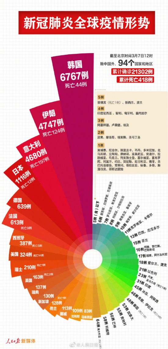 截至北京时间3月7日12时,除中国外,94个国家和地区累计确诊21302例新冠肺炎,累计死亡418例。