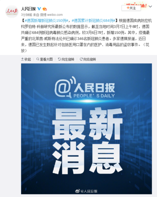根据德国疾病防控机构罗伯特·科赫研究所最新公布的数据显示,截至当地时间3月7日上午8时,德国共确诊684例新冠病毒肺炎感染病例,较3月6日7时,新增150例。其中,疫情最严重的北莱茵-威斯特法伦州已确诊346名新冠肺炎患者。多家德媒报道,近日来,德国已发生数起针对包括医用口罩在内的医护、消毒用品的盗窃事件。