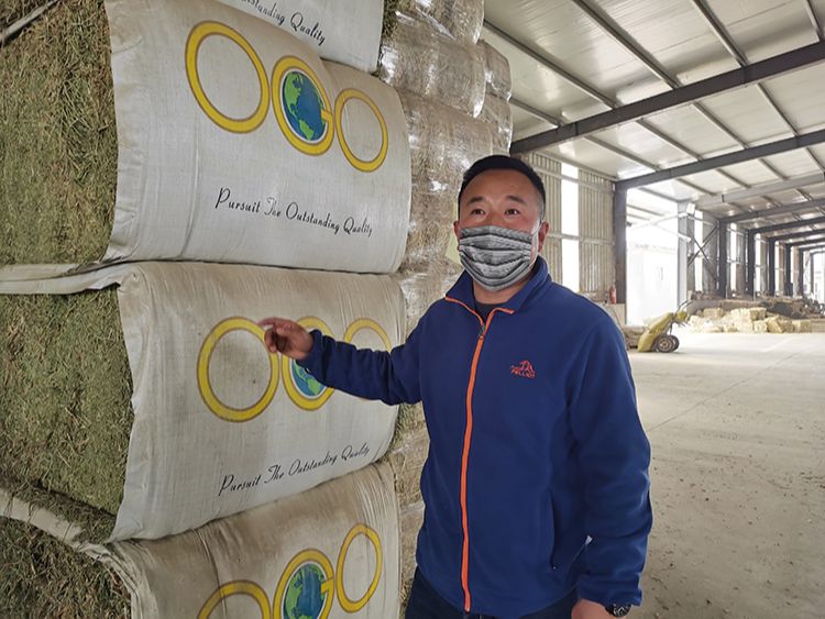跟着葛飞,记者一行来到储存奶牛口粮的仓库中,澳大利亚的燕麦、美国和西班牙的苜蓿草、还有国产的颗粒饲料,堆得满满当当。