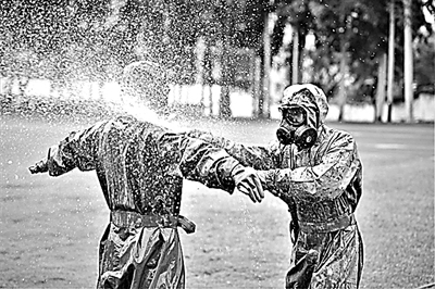 武警广西总队机动支队组织防化分队官兵展开防化救援应急演练,图为防化分队官兵对进入染毒区域的队员进行清洗消毒。余海洋摄/光明图片