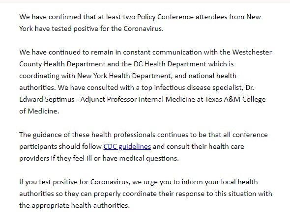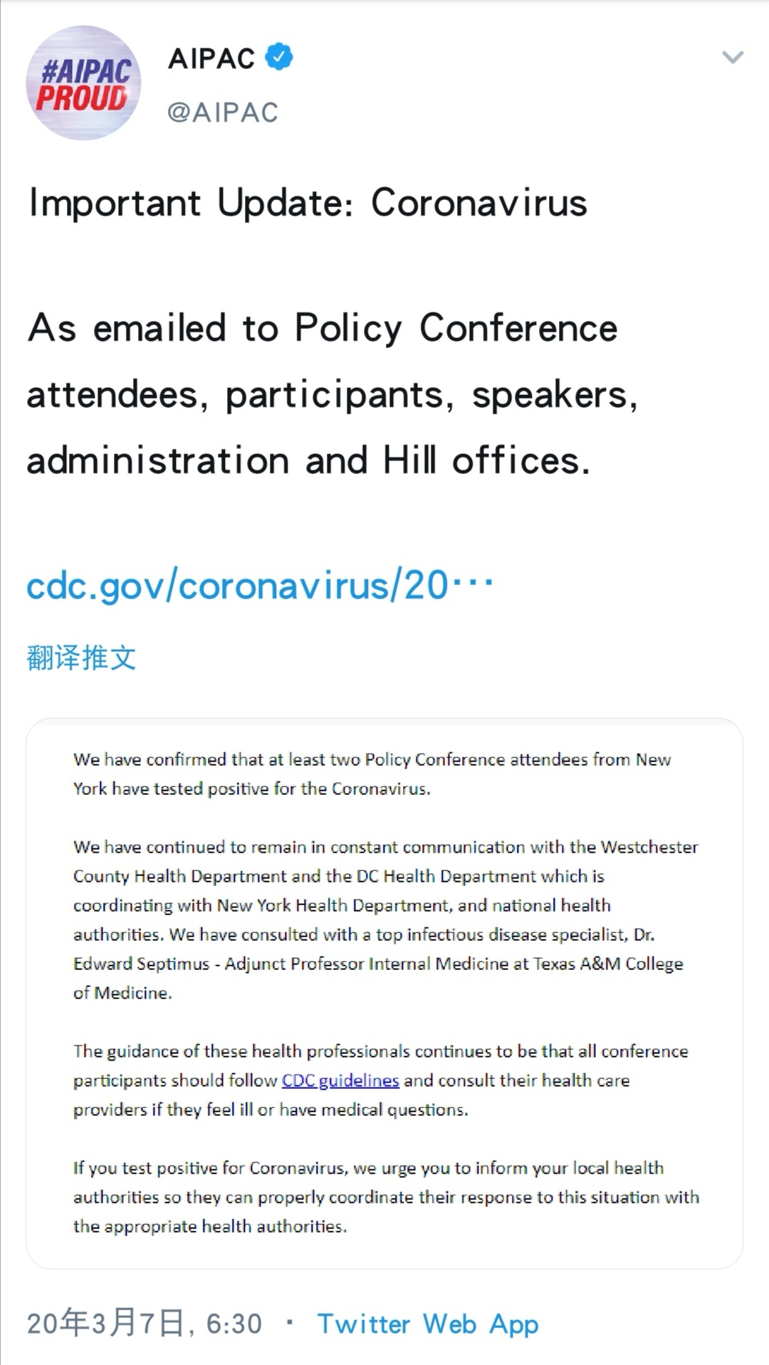 美国-以色列公共事务委员会(AIPAC,下称:美以公共事务委员会)在声明中说,这两名确诊患者来自纽约,前往首都华盛顿特区参加此次年会,之后被确诊新冠肺炎。该组织提示所有参加年会的人士遵守美国疾控中心相关疫情防控措施,并表示将和纽约州、华盛顿特区两地的卫生部门保持密切联系,跟进后续消息。