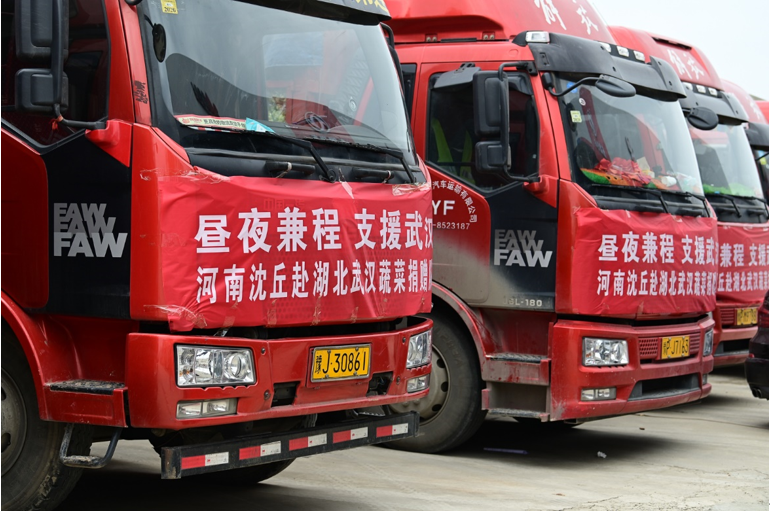 2020年3月1日,河南沈丘县政府为武汉一线送来扶贫菜,卡车司机们在武汉短暂的集合点就是郊区的武汉盛世旭东汽车贸易有限公司停车场。常年跑运输的卡车司机对这里都很熟悉,车子有问题就来这里保养维修。