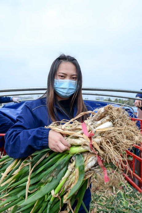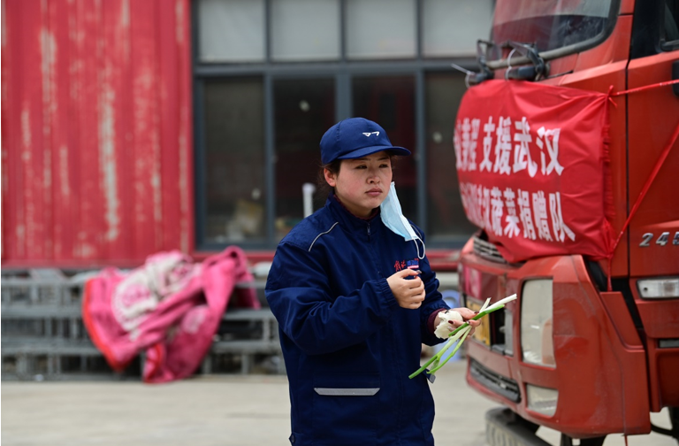 90后张黄媛也加入到搬大葱的队伍中,同卡车司机们一起,将蔬菜平均分配到各辆车上。一捆捆大葱分量不轻,张黄媛需要铆足力气将大葱扔到车上。像这样的搬运物资的事儿,在疫情期间,张黄媛和修车的同事们每天都在做。