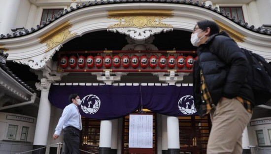 △在日本东京,行人戴口罩经过一家暂停开放的剧场。(图片来源:新华社)