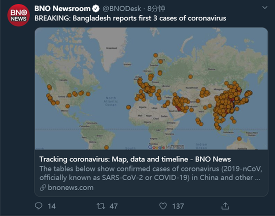 海外网3月8日电 据荷兰媒体BNO Newsroom报道,孟加拉国首次确诊3例新冠肺炎确诊病例。