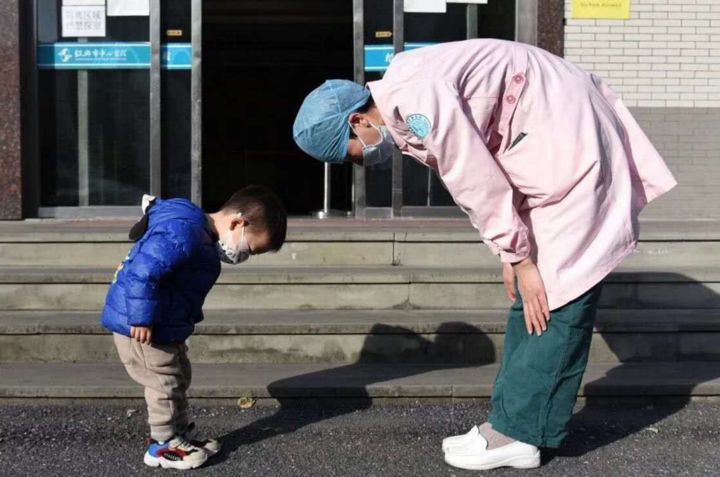 曹玲玲受关注,源于一张照片:2月22日,一名2岁的患儿嘟嘟(化名)治愈出院时,突然向一旁的曹玲玲鞠躬,而曹玲玲也立马还礼。