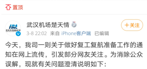 荔枝新闻讯,3月8日,一则《湖北机场集团关于做好复工复航准备工作的通知》在网络流传。8日晚,武汉天河机场官微@武汉机场楚天情 发布声明,回应网上流传关于做好复工复航准备工作文件的消息,强调通知管理人员返岗属公司内部正常工作安排,不代表已正式确定具体复航日期。详情》